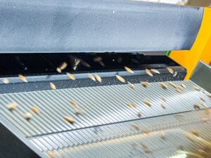 The buildout took months of research. Saturley consulted farmers, co-ops, and other operators to understand what combination of equipment could handle the varieties and conditions Breadtopia works with. He eventually assembled a line that includes an aspirator, a dehuller for hull-on grains like einkorn, and an optical sorter that identifies off-color kernels and damaged grain with remarkable precision. “The optical sorter is the one that I plug in the parameters of what we’re keeping and what we’re not keeping,” he explained. “By using the cameras, it tells the jets to separate into channels.”